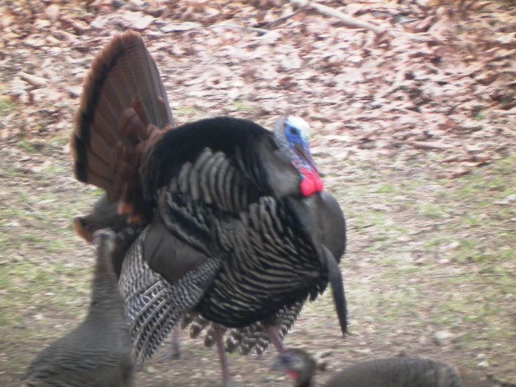We also had turkeys in the yard for the first time in months. A rafter of 8 hens has been stopping by for corn and acorns.